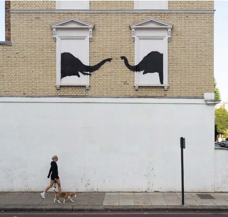 This mural in southwest London depicted two elephants peering through blocked-out windows, with their trunks almost touching. The work suggested themes of confinement, isolation, and the yearning for connection, mirroring how animals are often confined in unnatural environments.