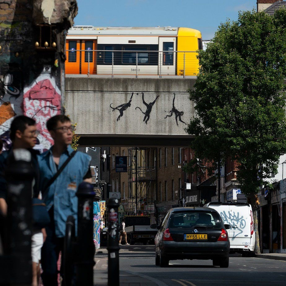 This piece, painted on a railway bridge in Brick Lane, showed three monkeys swinging as if carefree, yet placed in an industrial urban landscape. The contrast between their playful imagery and their harsh surroundings possibly critiques the displacement of wildlife due to