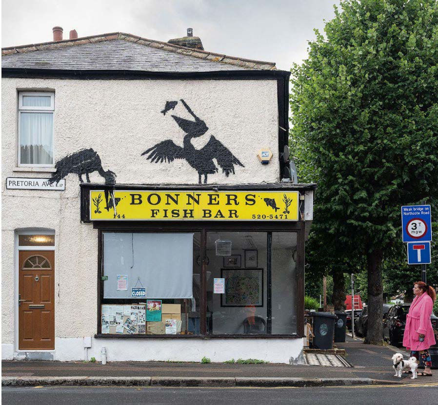 Above a fish and chip shop in Walthamstow, Banksy painted two pelicans eyeing fish. This humorous piece appeared to play with the idea of animals being out of place, possibly hinting at our relationship with food and consumption.