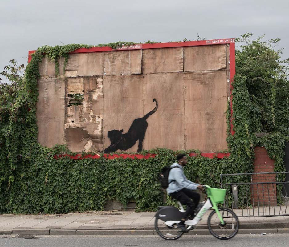 This mural of a cat stretching was painted on a billboard in Cricklewood but was swiftly removed for safety reasons. Cats are often seen as symbols of independence and mystery, perhaps contrasting with the theme of captivity present in other murals.