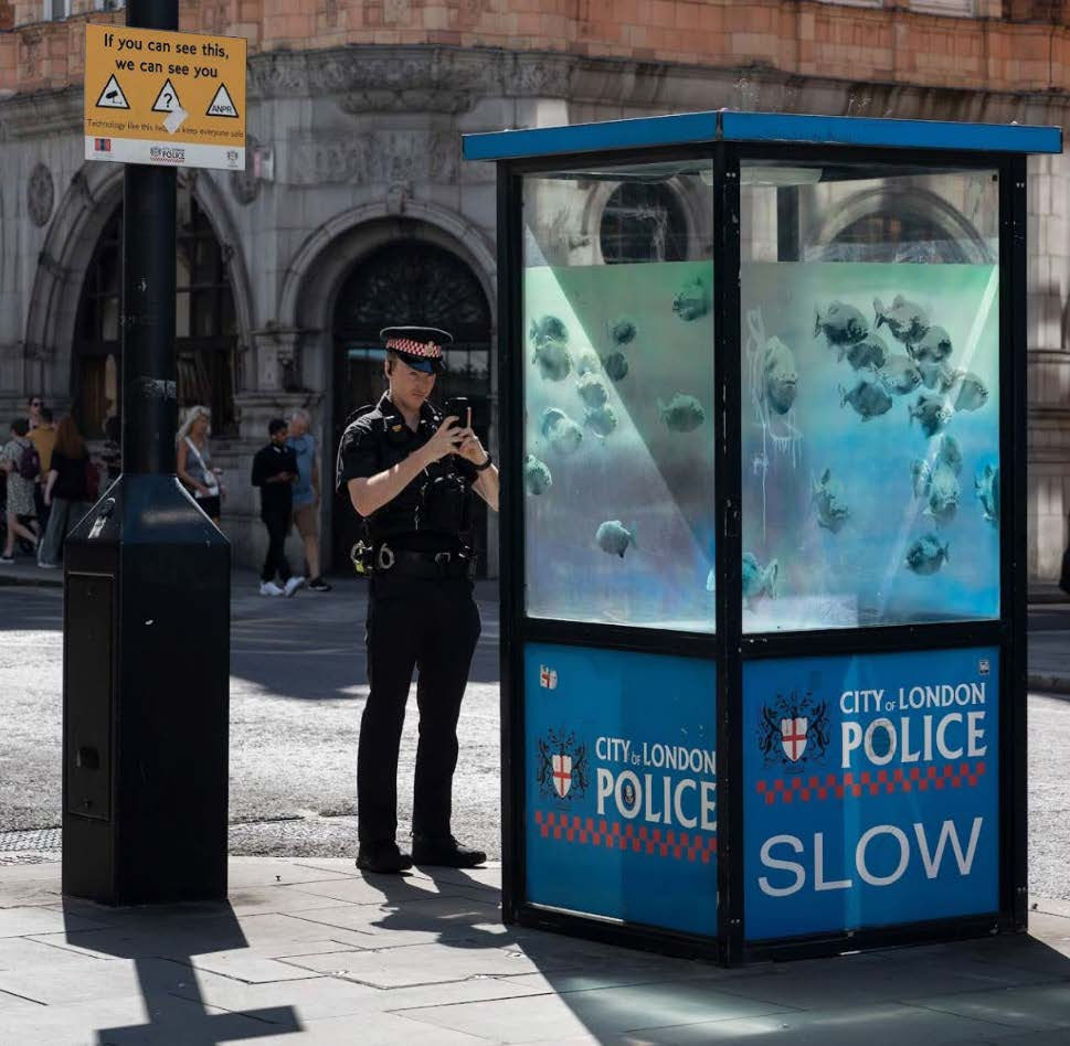 On Ludgate Hill, near St. Paul's Cathedral, Banksy transformed a City of London police sentry box into an aquarium filled with translucent piranhas. This artwork hints at the hidden dangers lurking beneath seemingly calm surfaces, perhaps reflecting the tension between law enforcement and societal control.