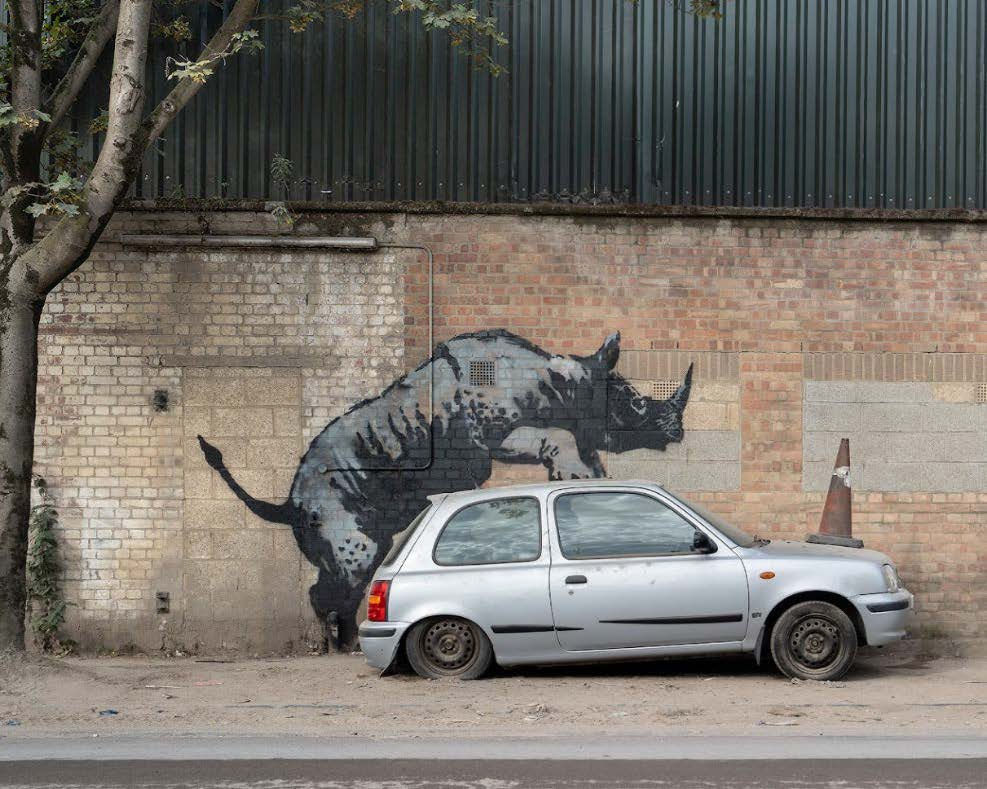 Located in Charlton, a humorous piece showed a rhino climbing onto a car, with a traffic cone placed on its head. This quirky image played with the absurdity of placing animals in human contexts, possibly commenting on how urban life can disrupt natural instincts.