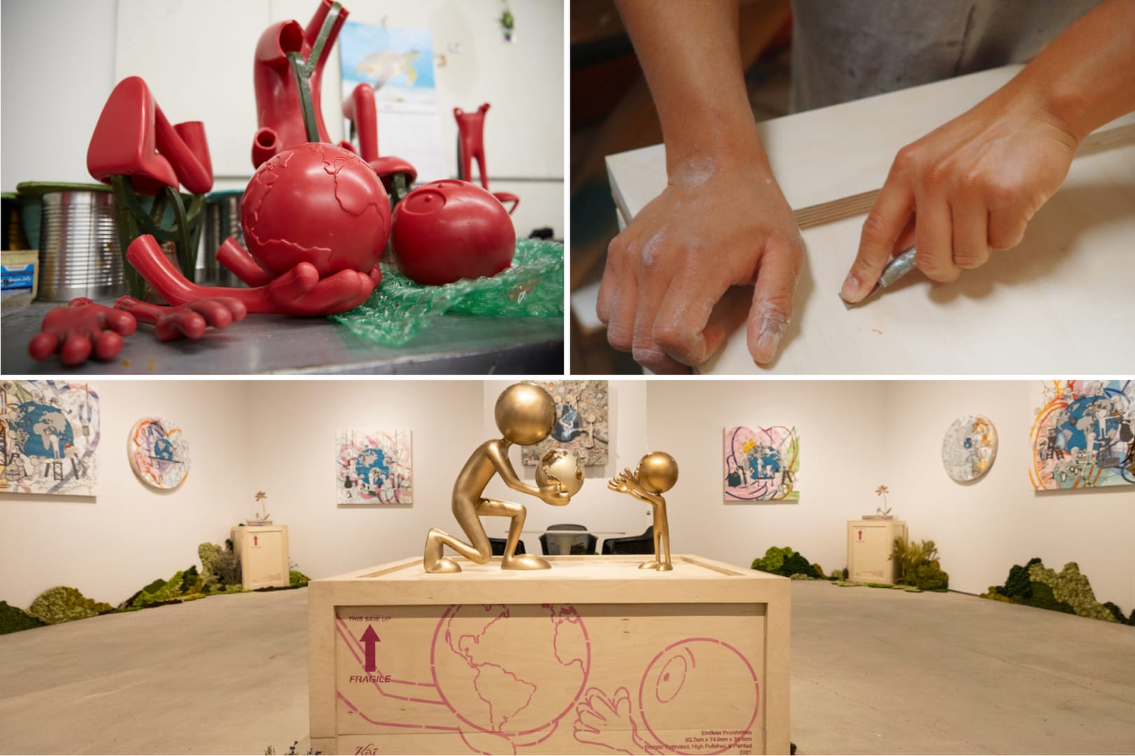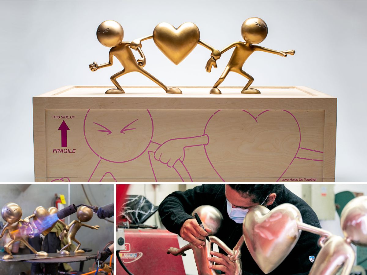 Works like “Endless Possibilities” (a parent passing the world to a child) and “Love Holds Us Together” (two figures straining yet bound by a single heart) combined symbolic storytelling with technical rigor: casting, patina, polishing — even the crates were hand-painted and designed to be part of the presentation rather than hidden away.