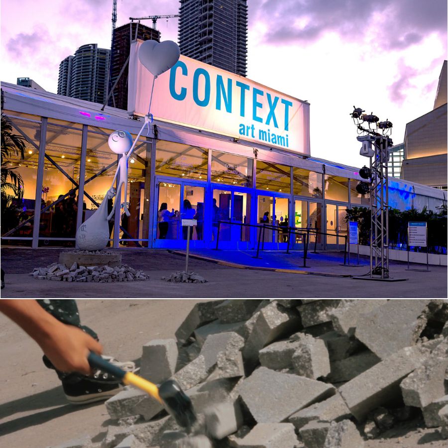 With sculpture, the labor only deepened. “Love vs. Money” (CONTEXT Art Miami, 2017), my first monumental work, stood on a round cement base that I poured on site. We built the form from plywood, bending it with water and heat to shape two half-circles. Once the base was set, we broke more than 100 cinder blocks by hand with a hammer, arranging each piece one by one, and brought it to life with light.