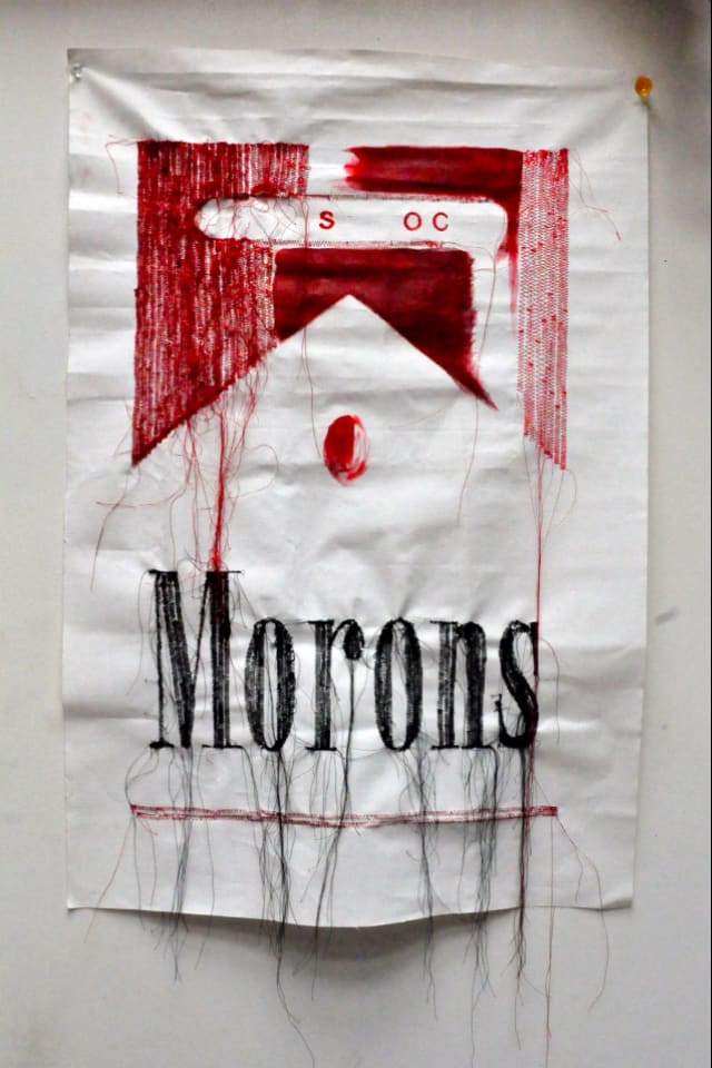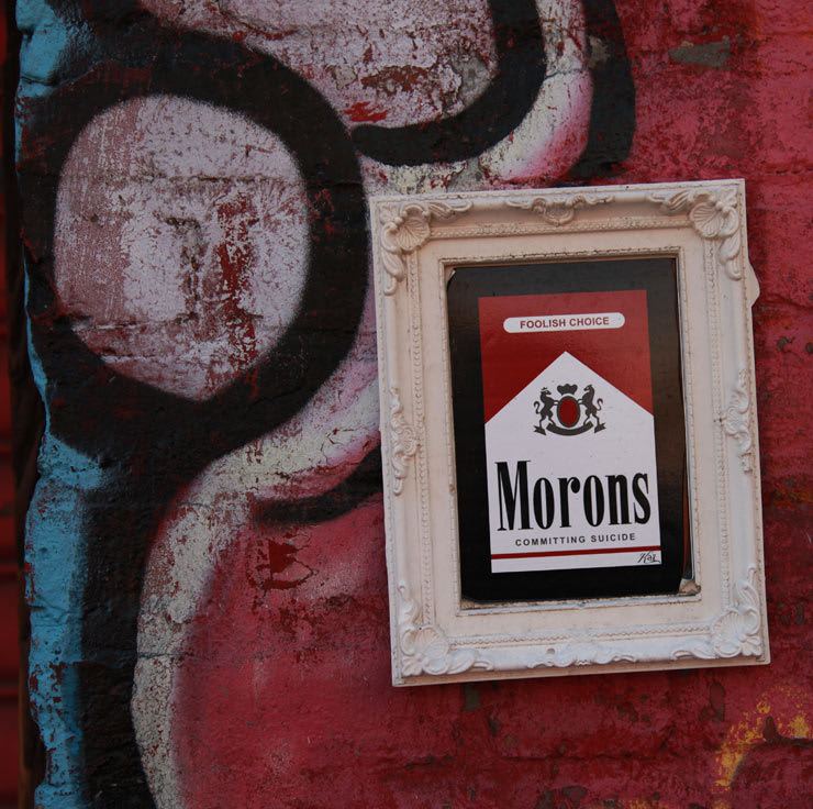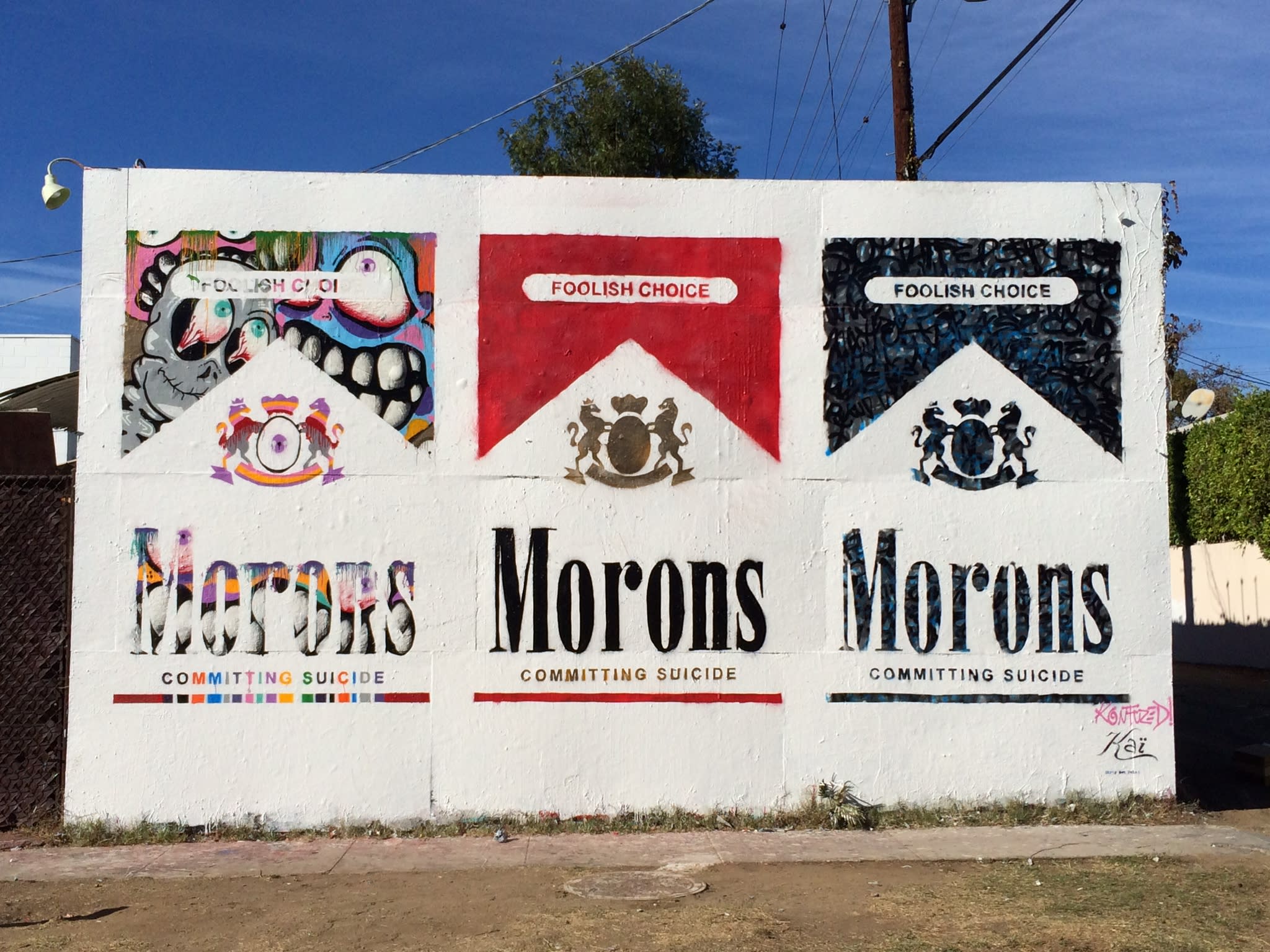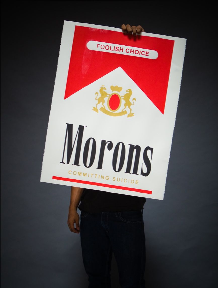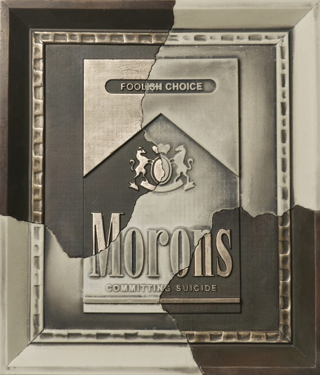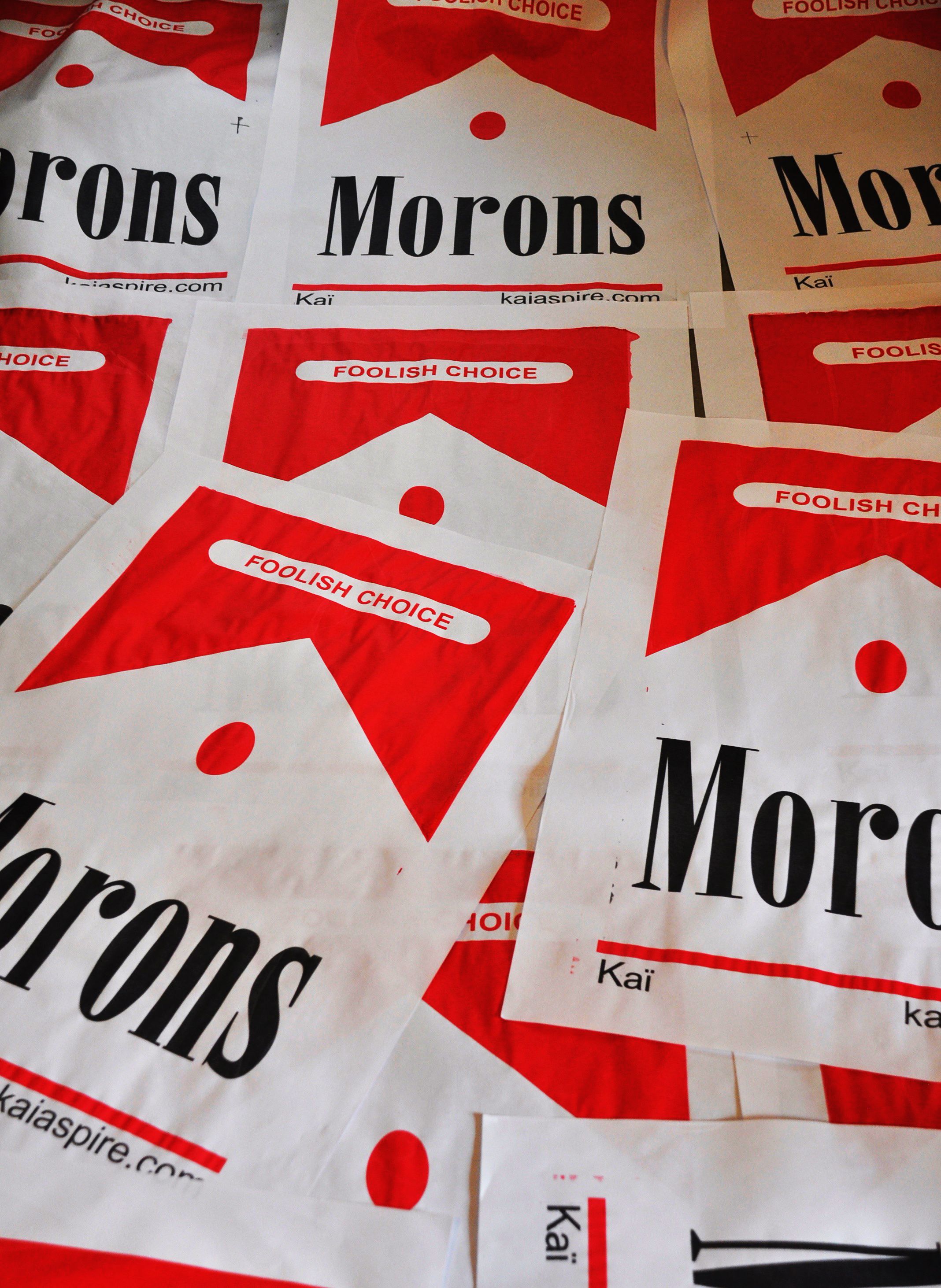 Since its debut, “Morons” has taken many forms: on posters, in ornate frames, across walls, and in three dimensions. Each version reflects a different moment in time, but the message has always been the same.
